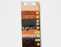 ここがポイント(1) (下塗り)配合した塗料を良くカクハンしてから刷毛塗りする。厚塗りし刷毛目のないように塗る。すぐにフルイにかけた均一な「もみがら」を全面にふりかけ3〜4日間乾燥させる。 ここがポイント(2) (下塗り)「もみがら」を全て取り除く。 |